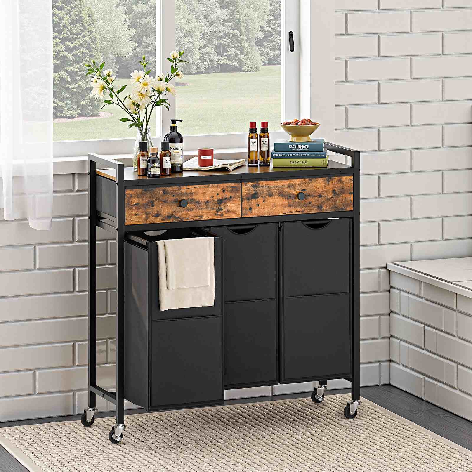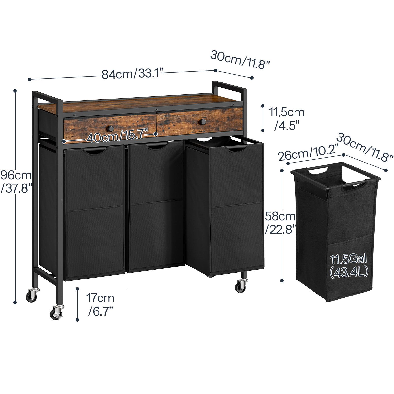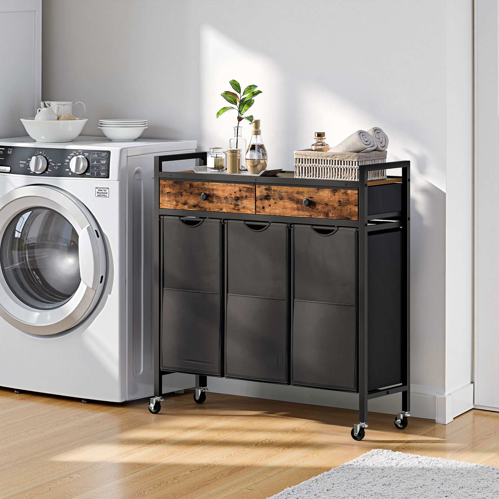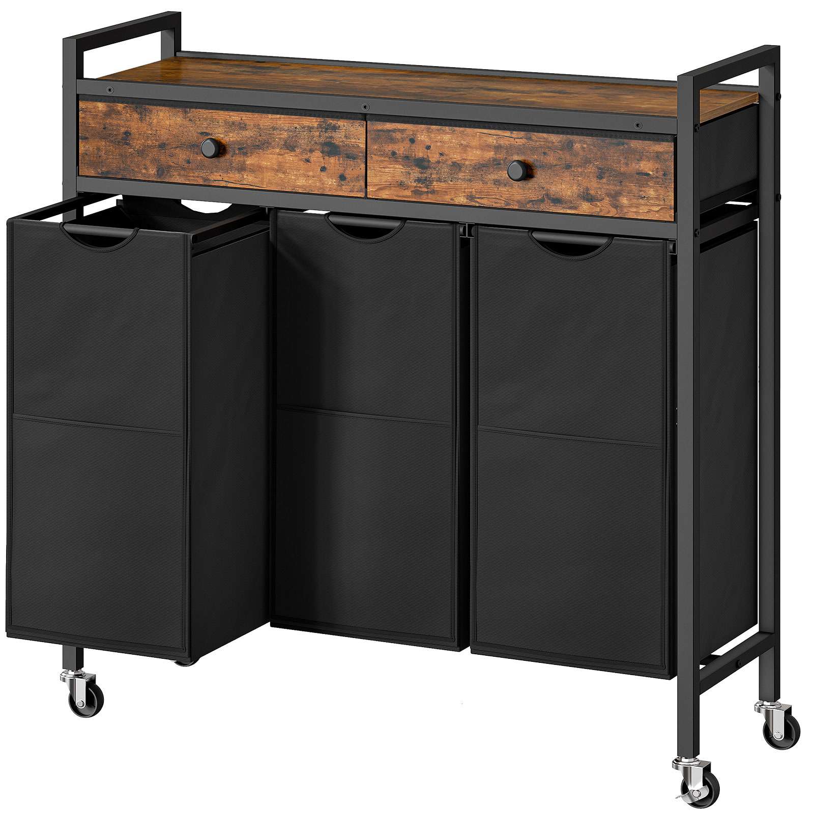 3-Abschnitt Wäschesortierer, Wäschekorb ausgestattet mit 2 Schubladen aus Vliesstoff, Ausziehbare, herausnehmbare Wäschesäcke aus Oxford-Stoff, Geeignet für die Verwendung im Waschraum, Rustikales Braun & Schwarz