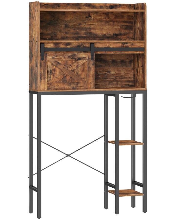 Über dem Toilettenschrank, Badezimmer-Organizer-Ständer mit Toilettenpapierhalter, Platzsparendes Toilettenregal, Schiebetür für die Scheune, Rustikalbraun und schwarz