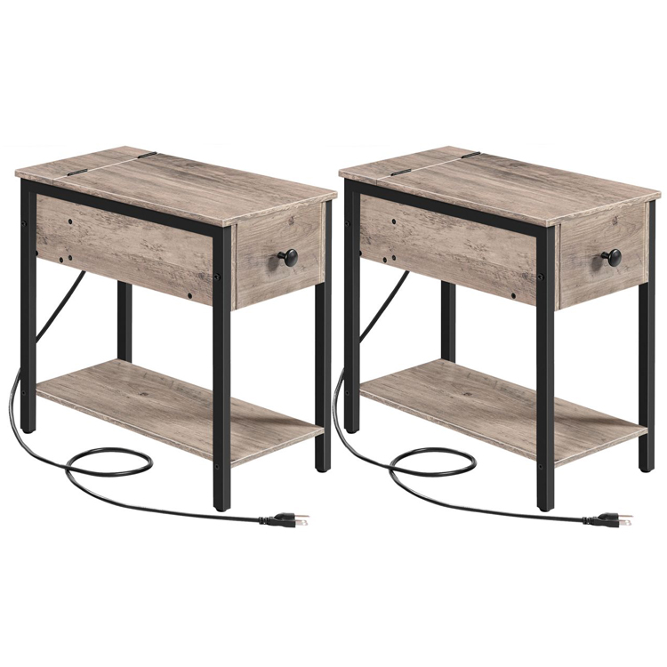 Nachttische mit einer Schublade und Ladestation, Satz von 2 Schmaler Endtisch mit USB -Anschlüssen & Power Outlets Wohnzimmer grau