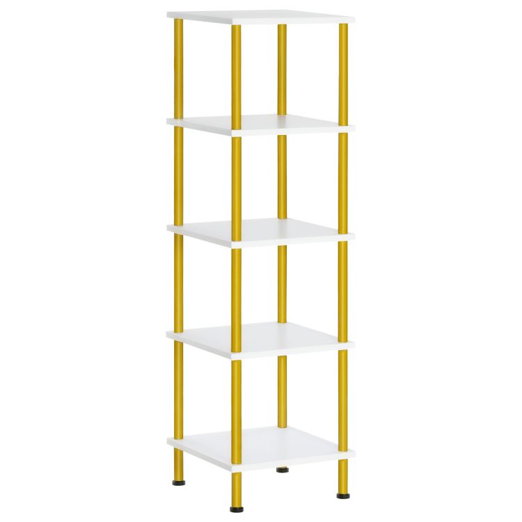 5-Tierschelfständer, Eckschütze -Schelfschelf, hoher Lagerständer Ständer, Eckbuchregal für kleine Räume, Wohnzimmer, Heimbüro, Küche, Weiß und Gold