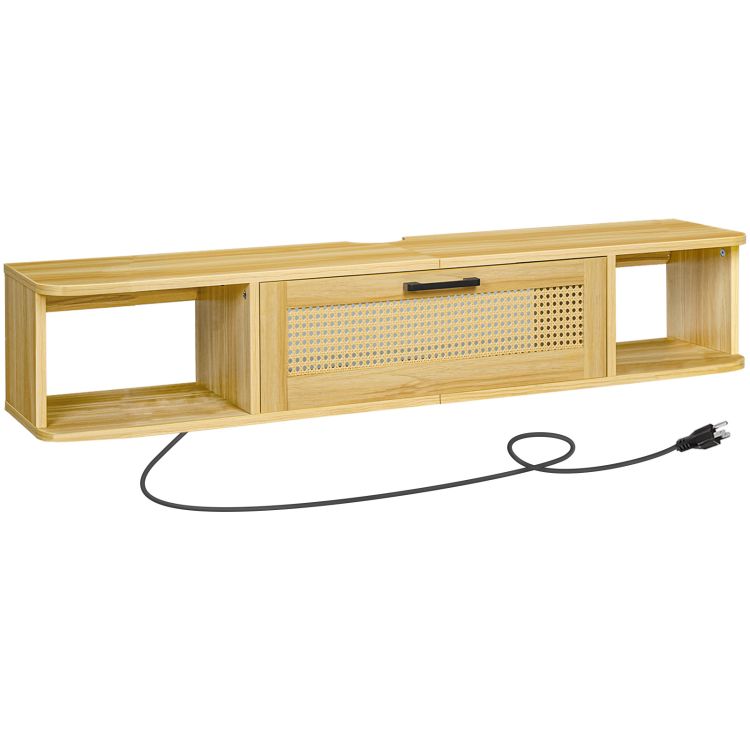 Schwebender Fernsehständer für Fernsehen bis zu 65 Zoll, Wandmontierter TV-Schrank mit 4 Power Outlet, Schwimmende Entertainment-Center-TV-Medienkonsolenregale mit herunterklappbarer Rattantür, Natural NL140UDS01