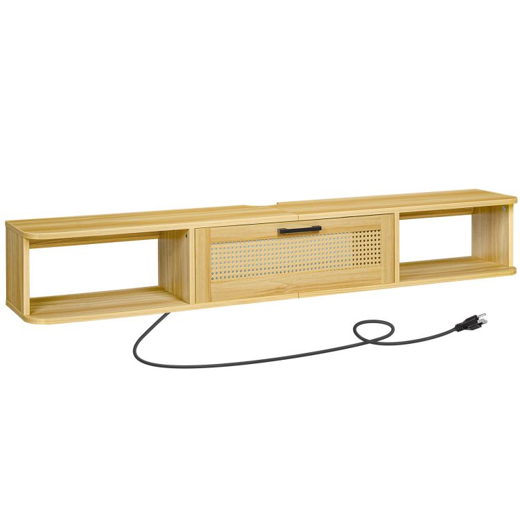 Schwebender Fernsehständer für Fernsehen bis zu 75 Zoll, Wandmontierter TV-Schrank mit 4 Power Outlet, Schwimmende Entertainment-Center-TV-Medienkonsolenregale mit herunterklappbarer Rattantür, Natural NL160UDS01