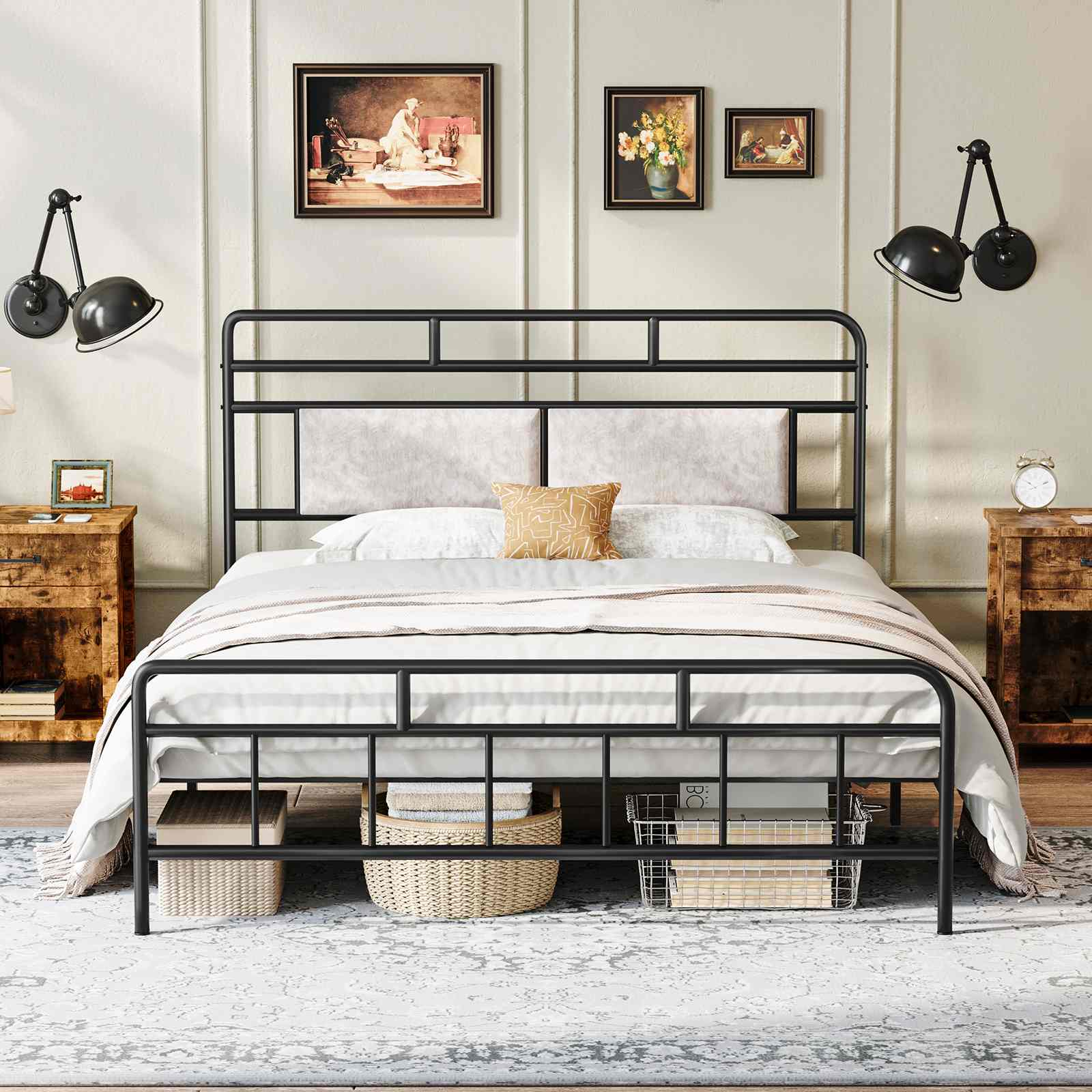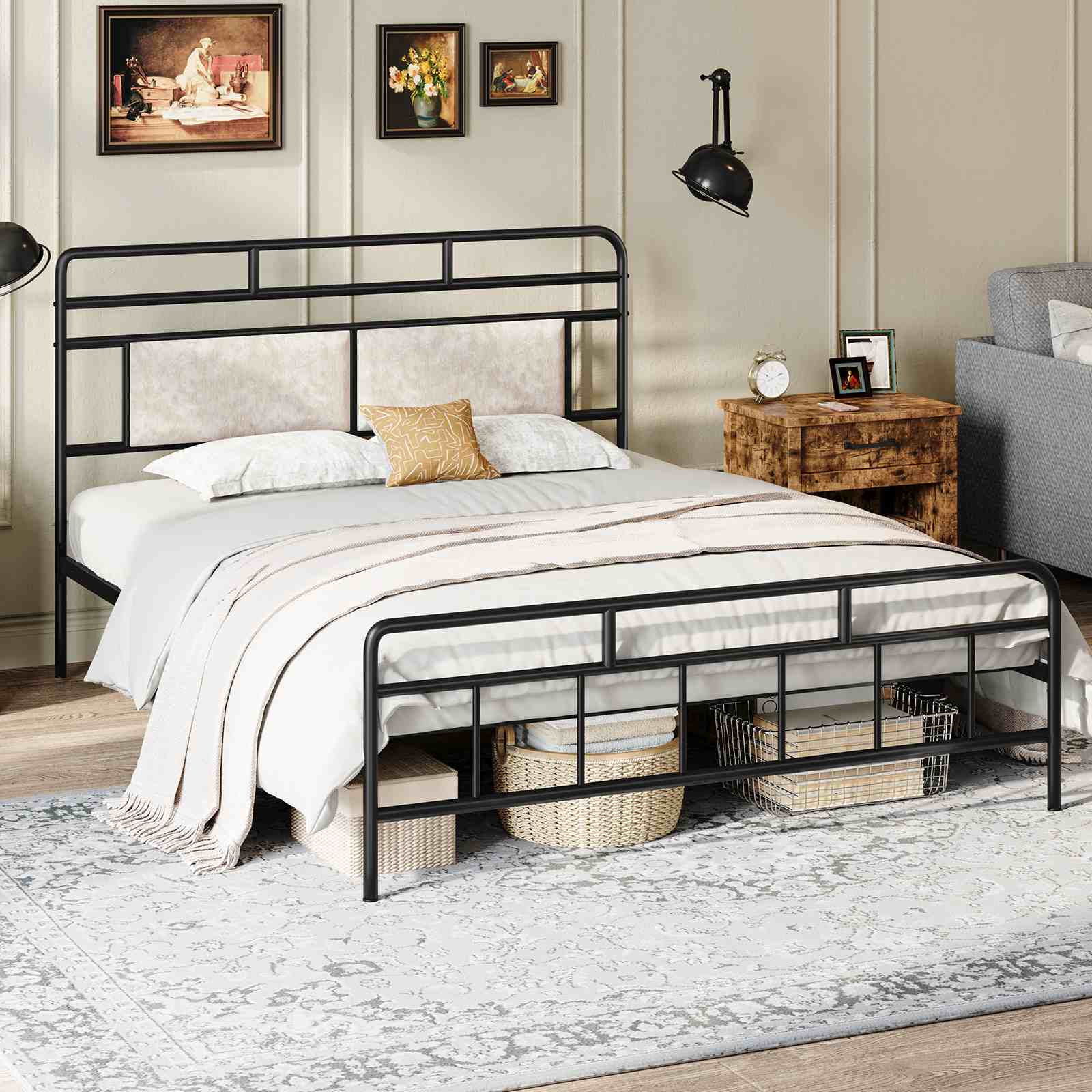 Διαχρονική κομψότητα: The bed frame combines sleek lines with a robust metal structure, skillfully softening the rigidity of the metal to form a unique rustic style. It can be seamlessly matched with various home decoration styles, συμπεριλαμβανομένων των σύγχρονων, traditional, farmhouse and country styles.