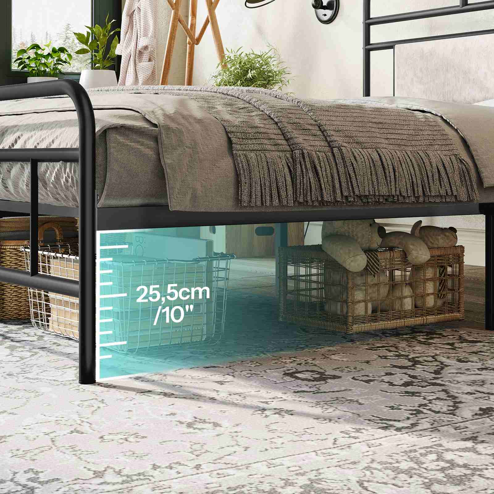 Αεριζόμενος σχεδιασμός: The open-frame structure enables air circulation, maintaining the freshness of the mattress. The ample under-bed space is suitable for placing storage boxes, facilitating organized storage of blankets, pillows and other items, and allowing convenient vacuum cleaning to keep the area tidy.