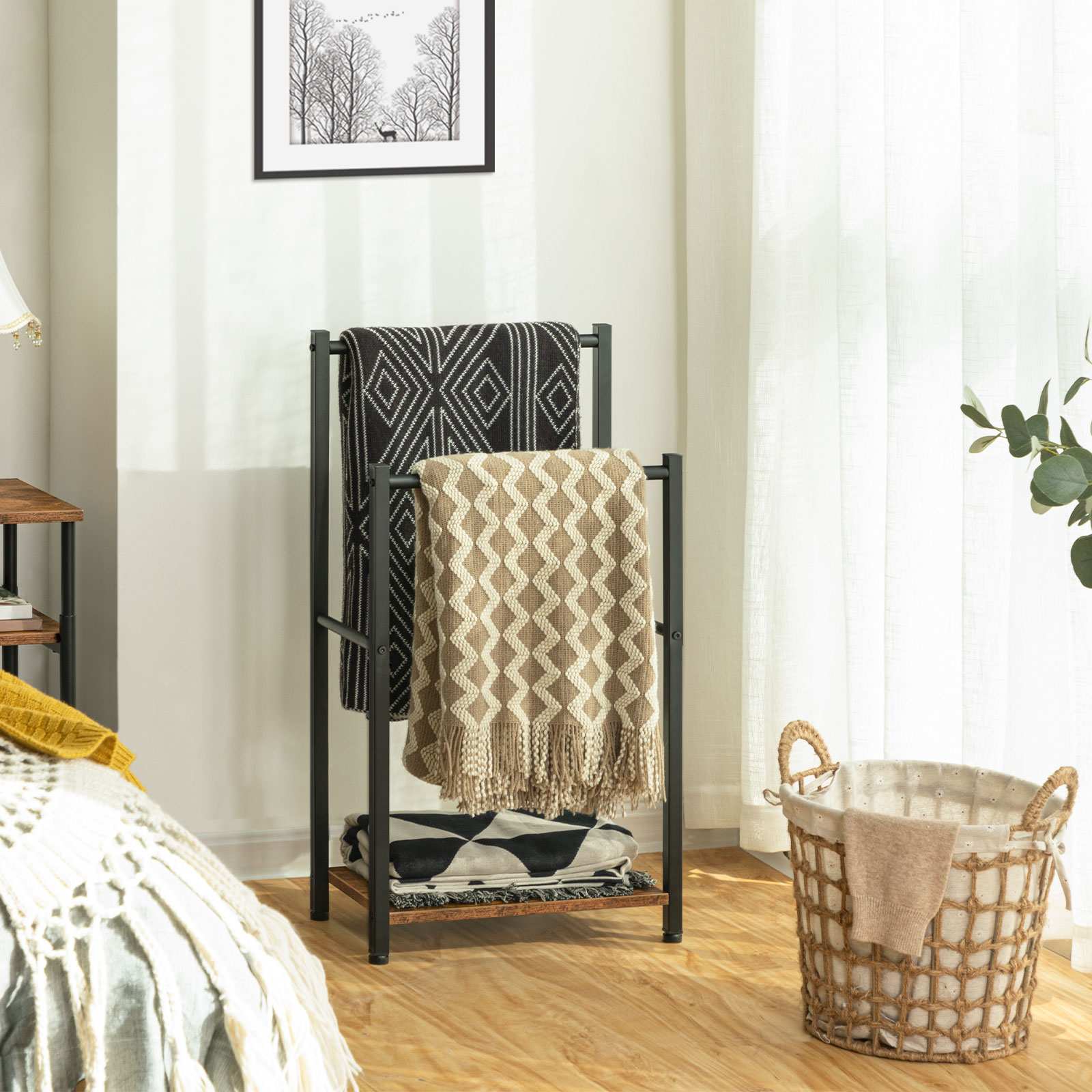 Elegant and Retro Aesthetics: Adopting retro-colored panels matched with a black metal frame, the towel rack integrates practicality with aesthetic appeal, serving as an excellent home decoration. Its minimalist design helps create a cozy and natural indoor atmosphere.