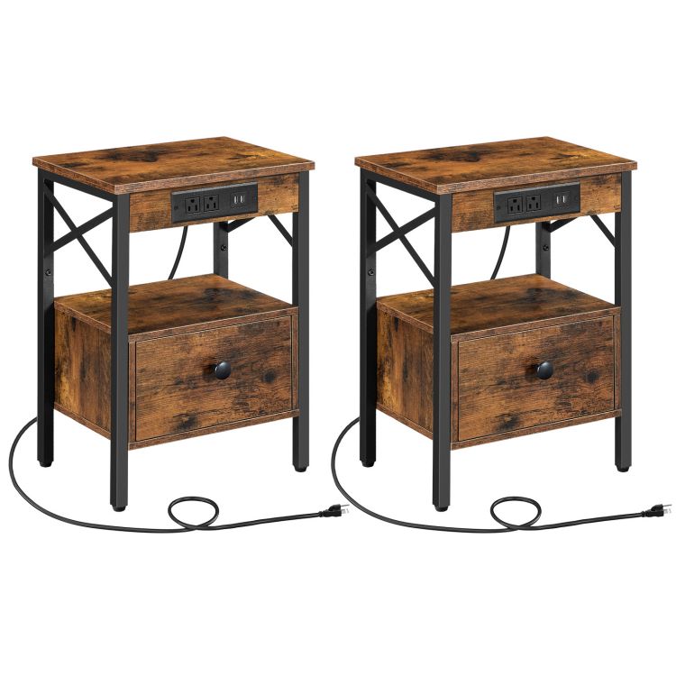 σετ νυχτερινών 2 με σταθμό φόρτισης, Τέλος τραπέζι με συρτάρι, θύρες USB και καταστήματα τροφοδοσίας, Καναπές καναπέ της νυχτερινής αγροικίας για υπνοδωμάτιο, εξοικονόμηση χώρου, ρουστίκ καφέ και μαύρο