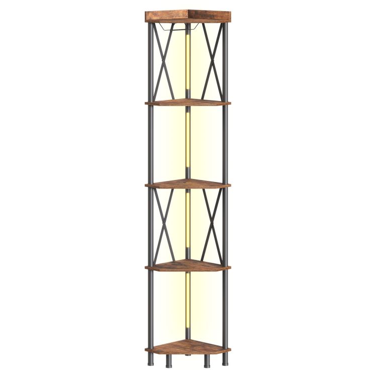 Γωνιακό ράφι με LED φως, 5-Ράφι αποθήκευσης γωνίας Tier, Ψηλό ράφι οθόνης, Ράφι αποθήκευσης με κάτοχο γυαλιού κρασιού, Γωνιακή βιβλιοθήκη για γωνιά τοίχου, Rustic Brown BF16DUCJ01