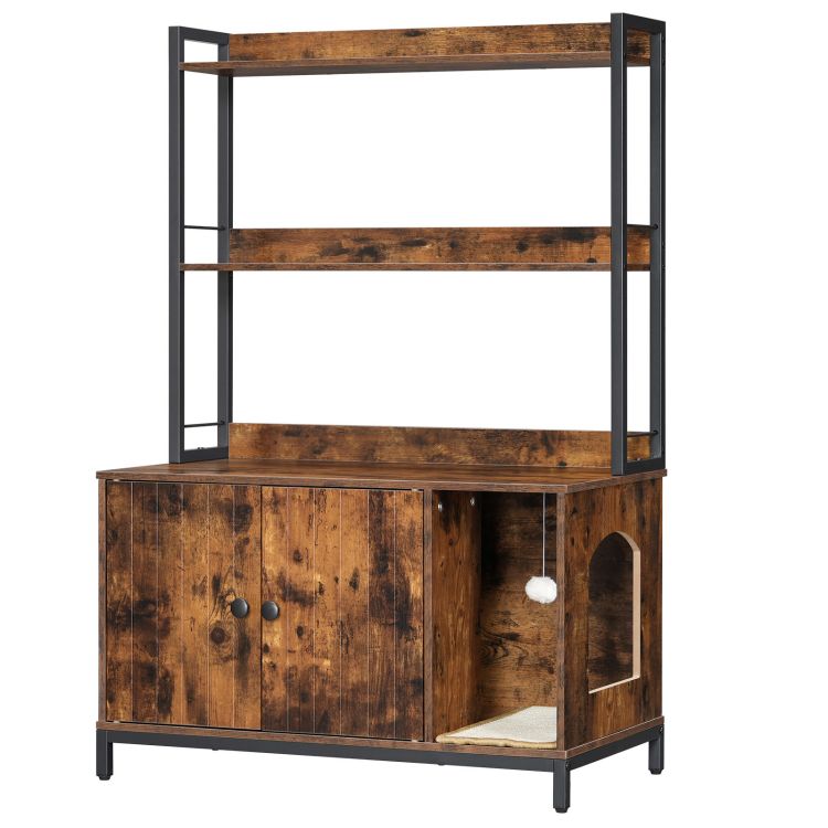 Ρουστίκ καφέ και μαύρο μεγάλο περίβλημα κιβωτίων απορριμμάτων γάτας με ράφια αποθήκευσης, Βιομηχανικά ξύλινα έπιπλα κουτιού, Κρυμμένο κιβώτιο απορριμάτων με μαξιλάρι γρατσουνιών, Ανθεκτικό και στερεό