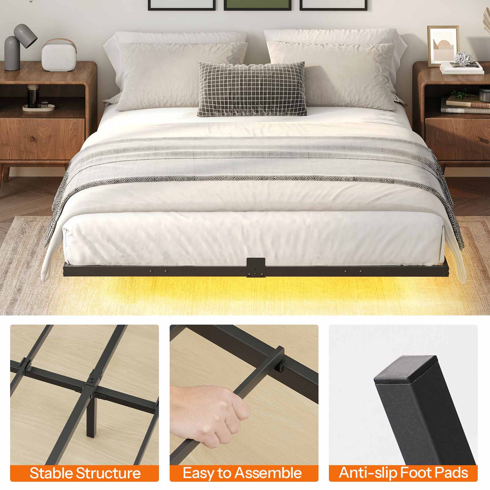 Πλωτό πλαίσιο κρεβατιού πλήρους μεγέθους, Κρεβάτι με μεταλλική πλατφόρμα βιομηχανικού στιλ με ενσωματωμένο σταθμό φόρτισης και φωτισμό LED, Σχεδιασμός Μείωσης Θορύβου, Δεν απαιτείται ελατήριο κουτιού, Μαύρο φινίρισμα