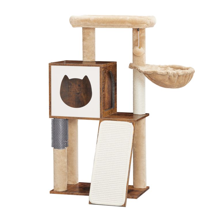 - adorable appearance: the combination of rustic brown and beige makes you feel comfortable. the cat home with a cat-head entrance and an arc entrance and the round plush hammock adds the cuteness to this cat tree for indoor cats and the exquisiteness to your home