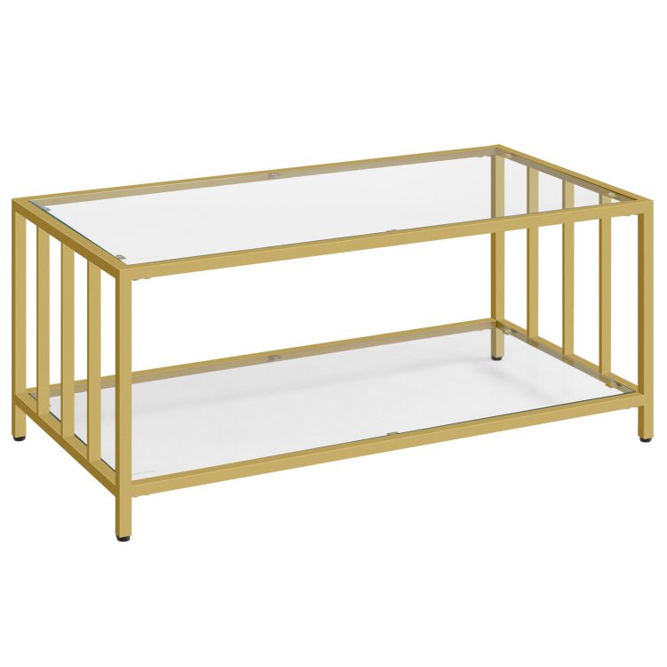 τραπέζι καφέ, 2-Τραπέζι γυαλιού με χρυσό πλαίσιο χάλυβα, τραπέζι καθιστικού, σύγχρονο απλό κεντρικό τραπέζι, Εύκολη συναρμολόγηση, Ανοιχτό ράφι αποθήκευσης για σαλόνι, γραφείο, golden gd03kf01