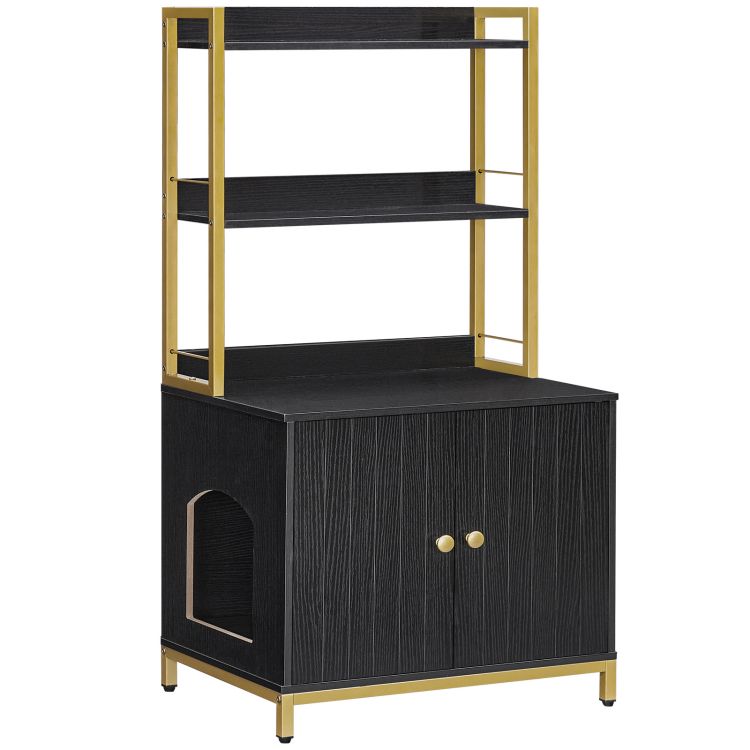Recinto de caja de arena negra y dorada con estantes, Muebles de caja de arena para gatos de madera, Gran caja de arena oculta con puertas, Armario de almacenamiento