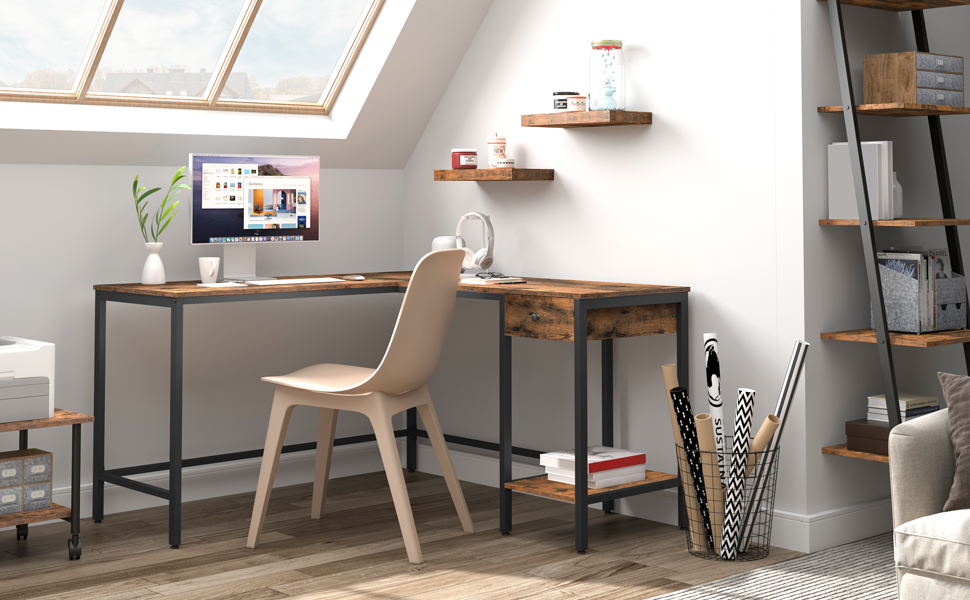 escritorio de computadora en forma de L, gran escritorio de esquina industrial, escritorio de oficina en casa con cajón y estante, Estudiar la estación de trabajo de PC, sostener 2 monitores, mesa de juego, robusto y estable, marrón rústico