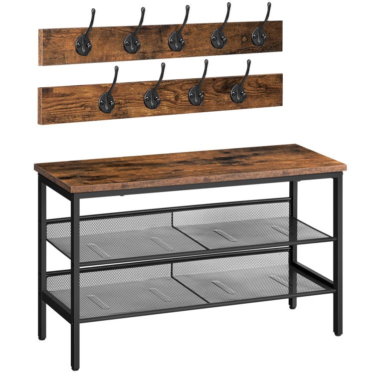 Perchero Banco De Zapatos, árbol del pasillo, 3-Zapatero de niveles con estantes de malla ajustables, Banco de almacenamiento de entrada con ganchos para abrigos, 3-Diseño en 1, Entrada, Sala de estar, Marrón rústico y negro
