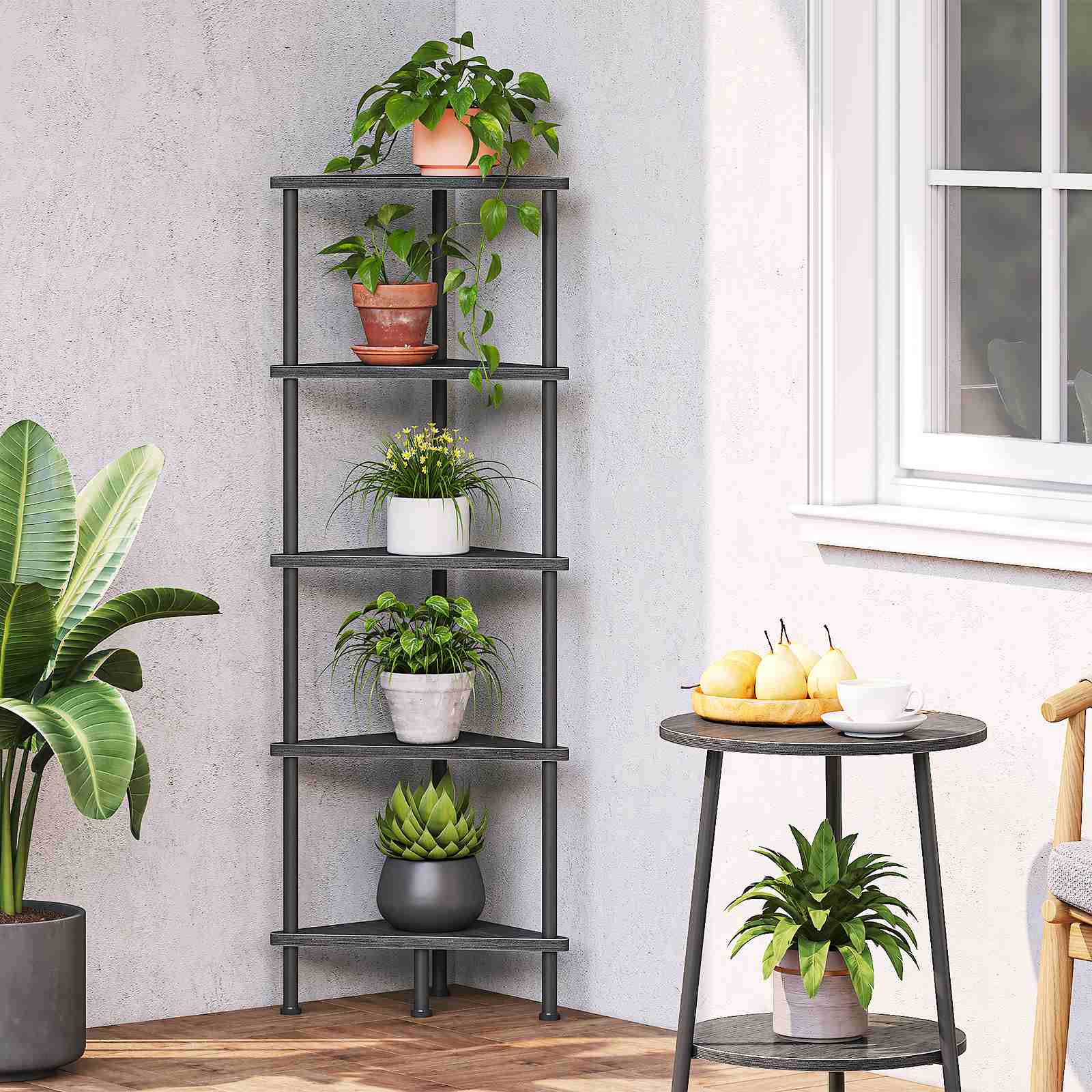 Estante esquinero industrial negro de 5 niveles, Estantería de esquina de pared con marco de metal, Estante de exhibición multifuncional para plantas, Flores y libros, Librería esquinera que ahorra espacio para dormitorio, Sala de estar