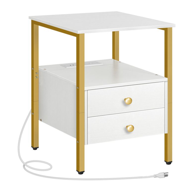 Mesa auxiliar con estación de carga, Mesita de noche con 2 Cajón & Puertos USB & Enchufes de electricidad, Mesita de noche para espacios pequeños, Estable y resistente, para sala de estar, Dormitorio, Blanco y dorado