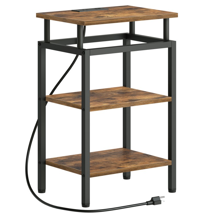 Mesa auxiliar con estación de carga, Mesa auxiliar con puertos y salidas USB, Mesita de noche pequeña con estante de almacenamiento de 3 niveles, Mesita de noche para espacios pequeños, Sala de estar, Marrón rústico y negro