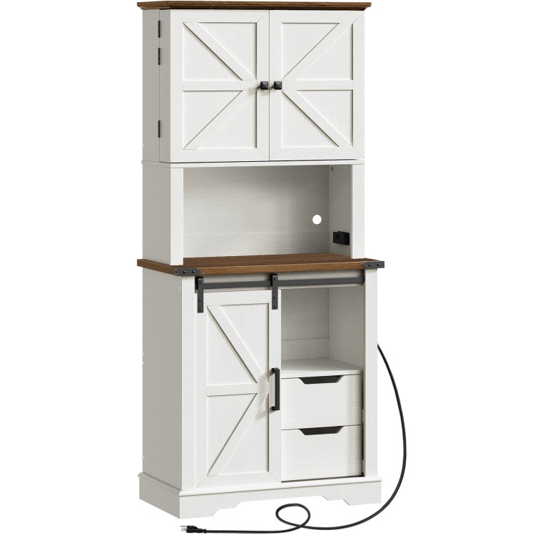 Cabinet de garde-manger de la ferme avec station de charge, garde-manger de la cuisine avec 2 tiroirs & porte de grange coulissante, Grande armoire de rangement en bois, armoire pour salon de salle à manger, blanc et