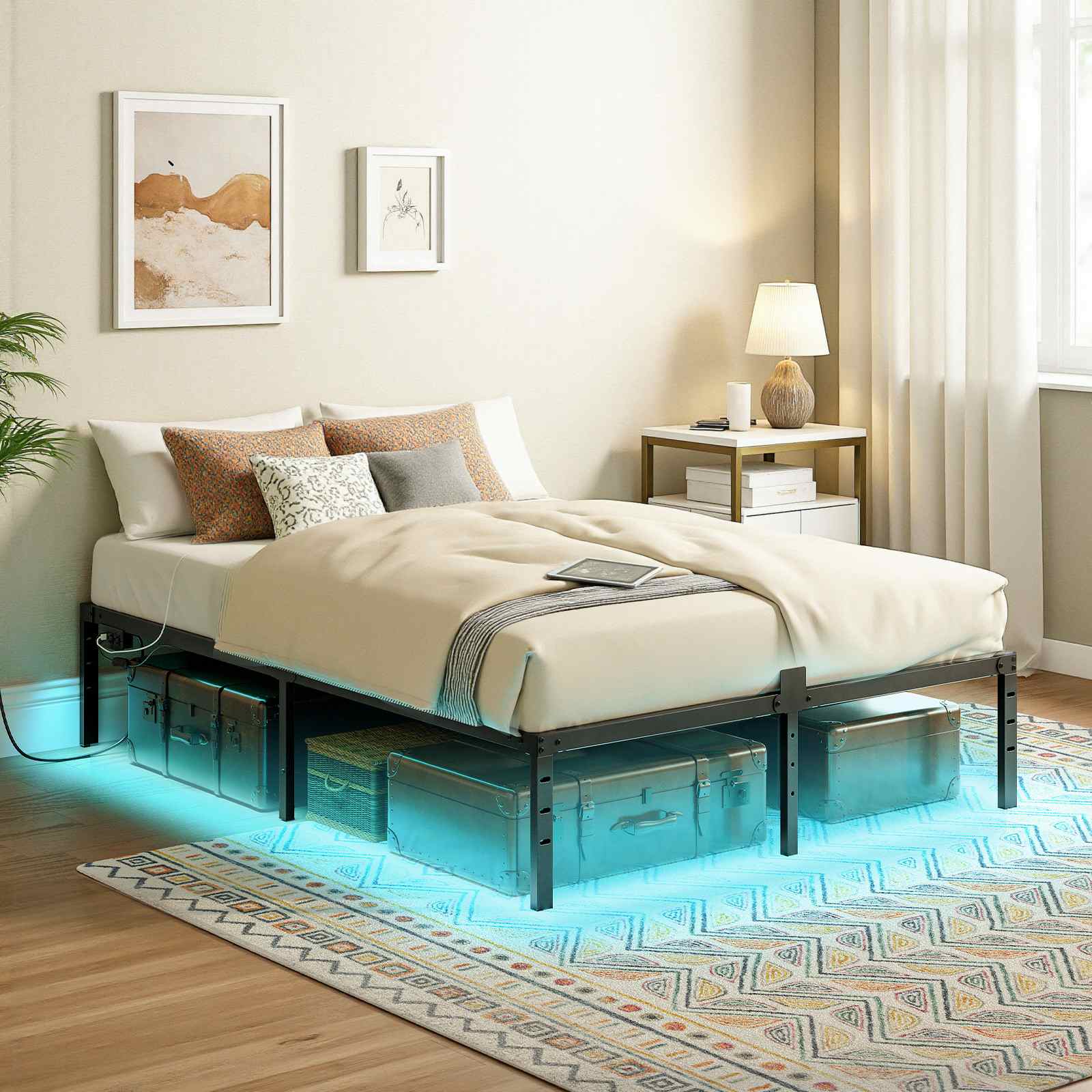 Cadre de lit complet avec des lumières LED, Cadre de lit plateforme en métal avec station de recharge, 2 Points de vente et 2 Ports USB, Cadre de lit pleine grandeur robuste, Grand espace de rangement sous le lit, Noir