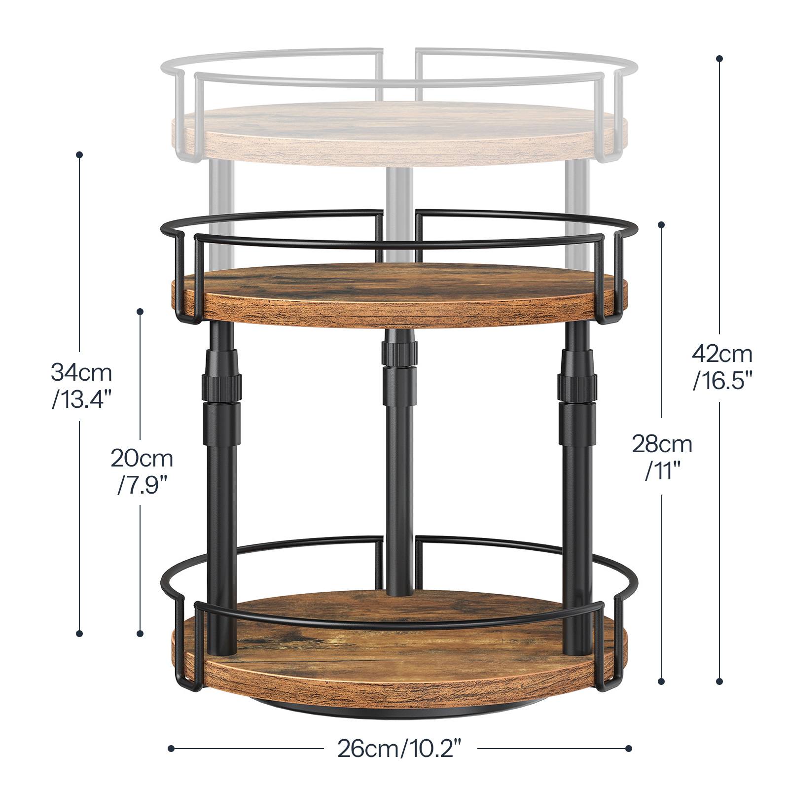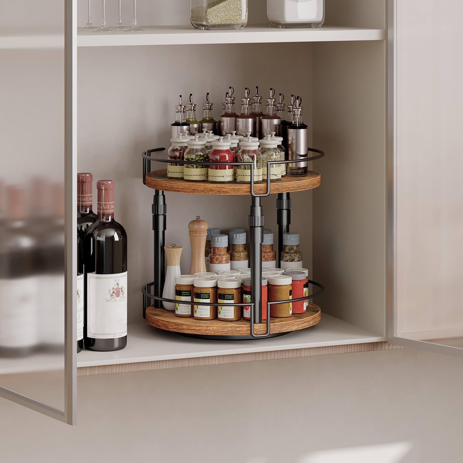 2-Organisateur d'épices Lazy Susan rotatif à hauteur réglable et à niveaux, Support à bouteilles d'assaisonnement marron rustique pour comptoirs et armoires de cuisine