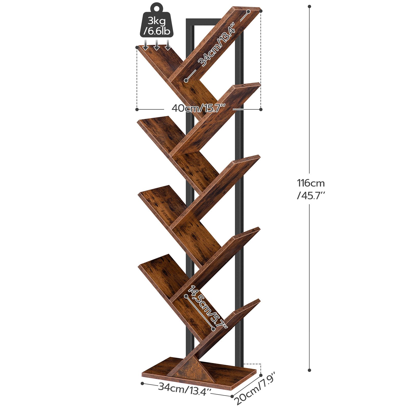 bibliothèque en forme d'arbre, 9-étagères en bois de bibliothèque de niveau, Rack de rangement debout au sol, pour l'affichage des CD, Livres dans le salon, bureau à domicile, Rack de rangement en bois pour chambre à coucher, marron rustique