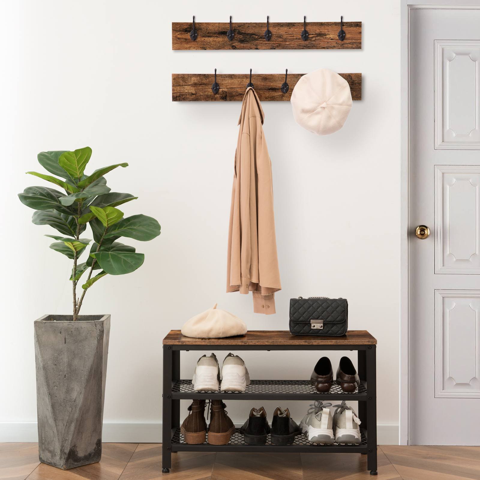 Integrated 3-in-1 Design: This entryway set includes 9 coat hooks arranged in 2 rows, paired with a sturdy shoe bench. The combination of wooden components and a metal frame works synergistically in the entryway to effectively eliminate clutter and maintain an orderly space.
