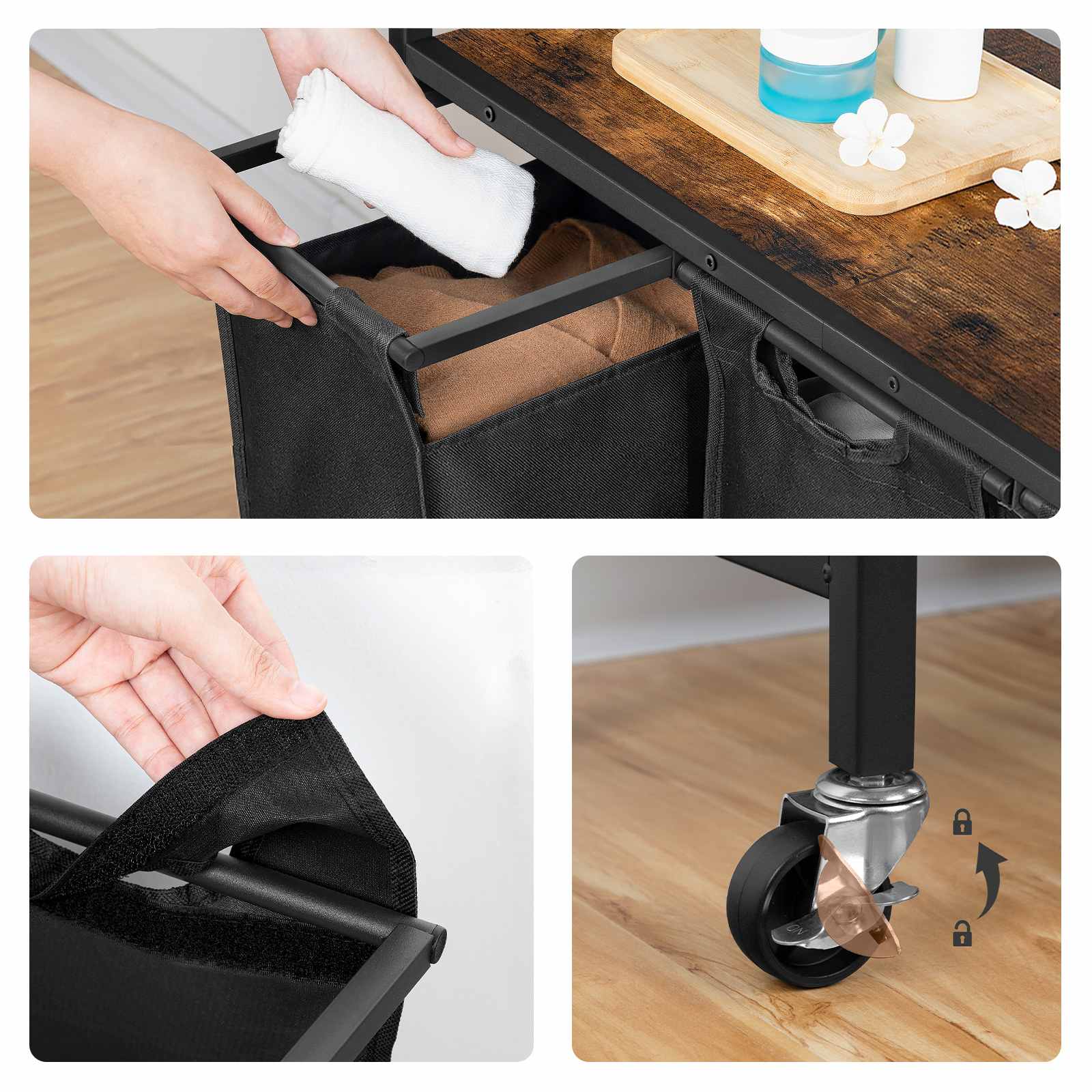 3-Trieuse de linge roulante Section, 34.5 Gallon (130L) Panier à linge à capacité totale avec roulettes verrouillables, Sacs amovibles en tissu Oxford, Brun rustique & Noir