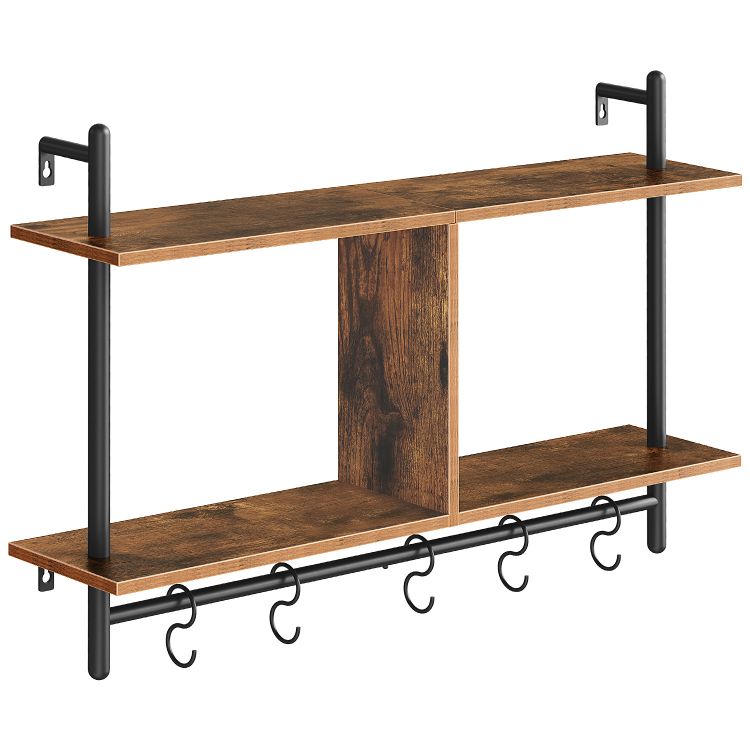 étagères flottantes, 30.3 étagère murale à 2 niveaux à 2 niveaux avec 5 crochets, pipe industrielle, Rack de rangement avec canne suspendue, pour le salon, salle de bain, cuisine, chambre à coucher, brun rustique et noir BF77BJ01