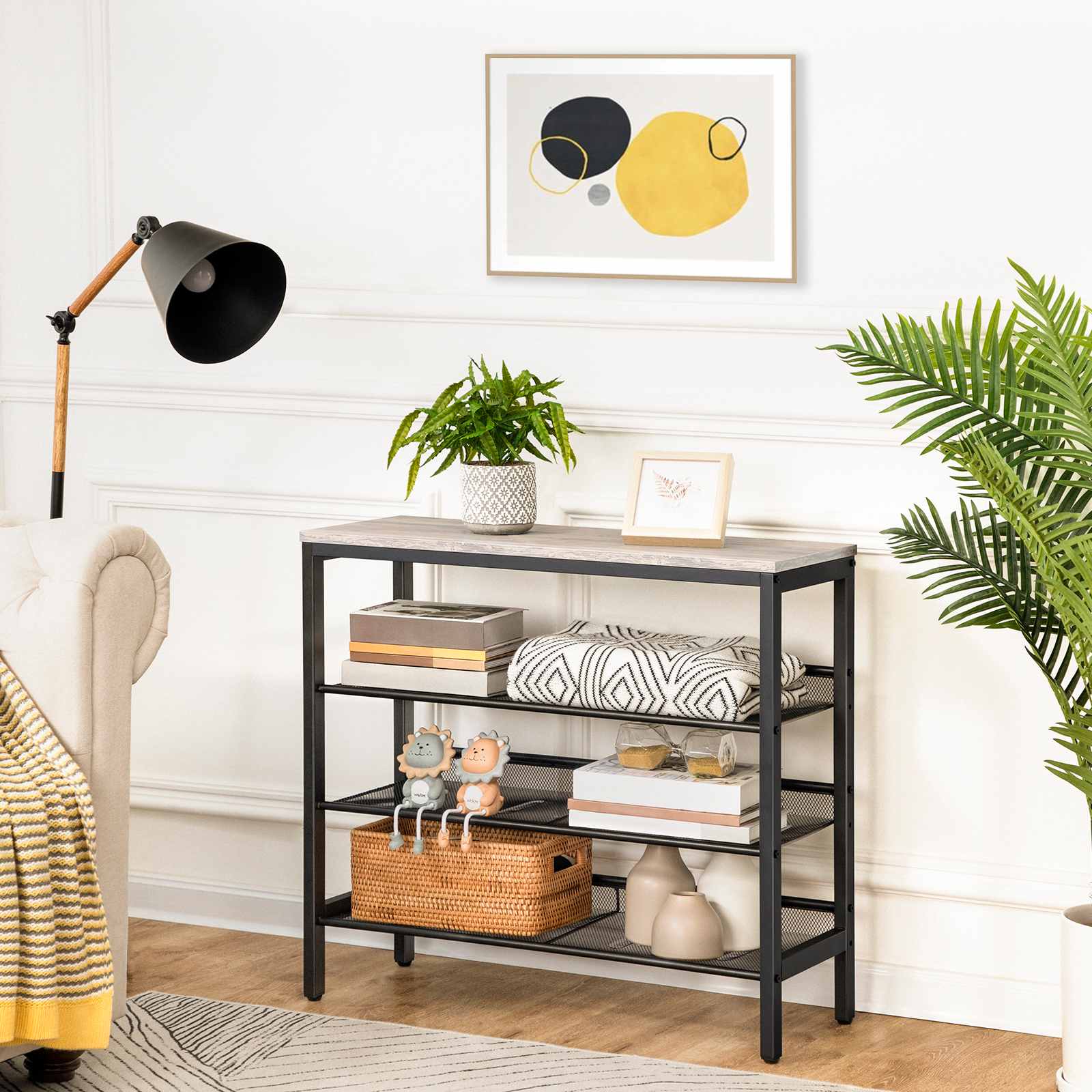 Étagère à chaussures industrielle grise à 4 niveaux, Organisateur de rangement avec 3 Étagères en maille, Meubles d'appoint d'apparence bois avec structure en métal, Convient pour l'entrée, Salon et couloir