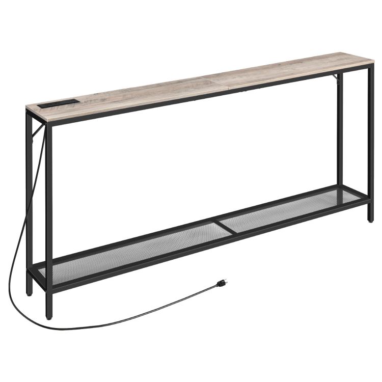 63 Table de canapé avec prises de courant, 2-Table console à niveaux avec station de recharge, Table de canapé, Table de canapé longue et étroite derrière, pour le salon, Entrée, Foyer, Grège et Noir
