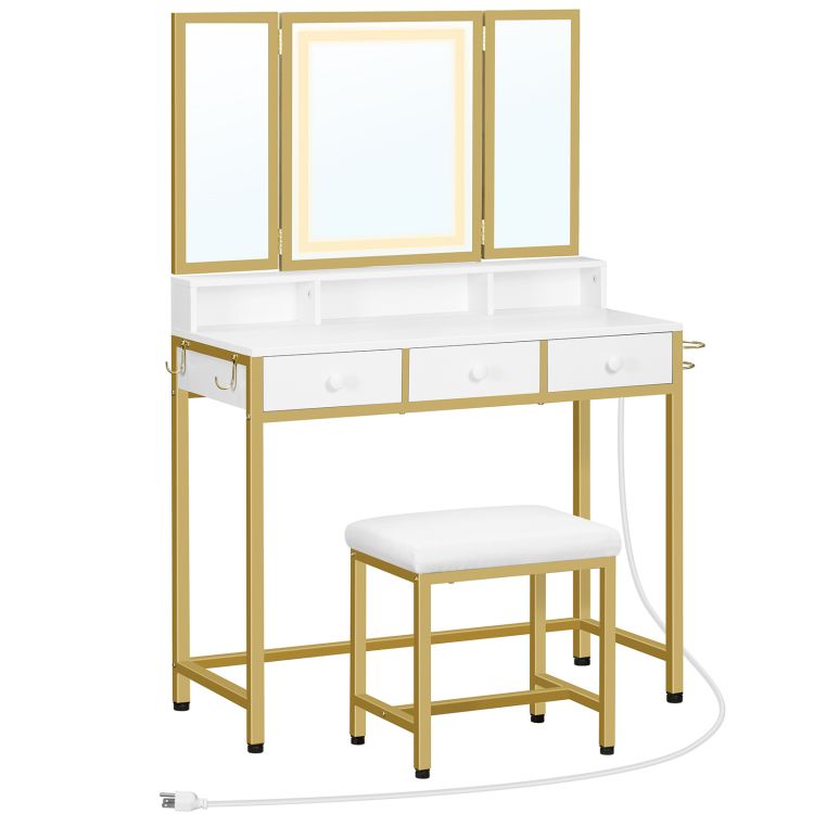 Ensemble de bureau de vanité, ensemble de vanité de maquillage, avec miroir et prise de courant éclairés à LED, table de vanité avec miroir trimolaire et 3 tiroirs, taboure de maquillage à éponge, pour la chambre, blanc et or