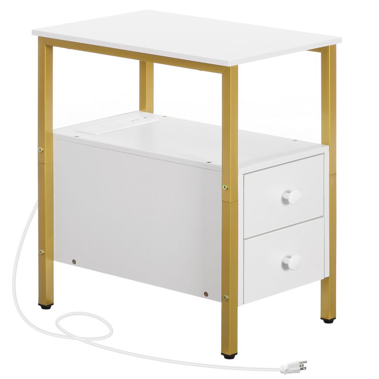 table d'appoint avec station de recharge, Table d'appoint étroite avec 2 tiroir & ports USB & prises de courant, Tablette de nuit pour les petits espaces, stable et solide, pour le salon, chambre à coucher, gold and white dw541bz01