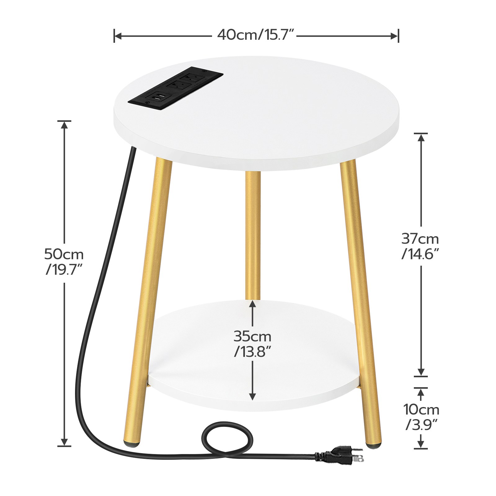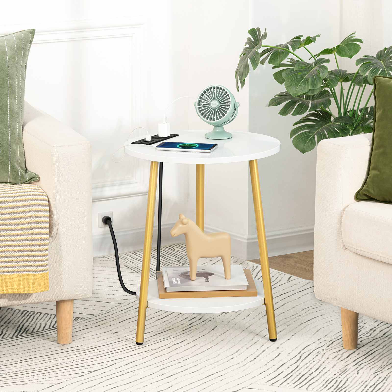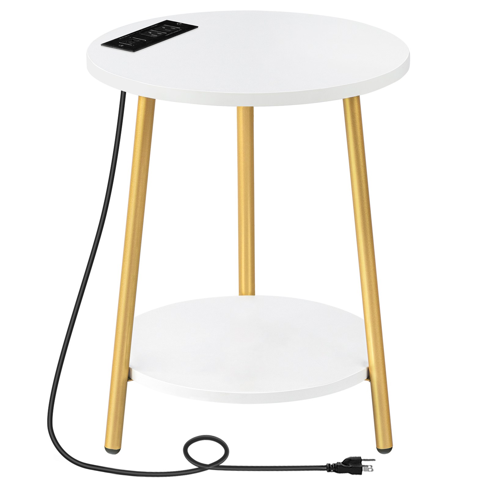 White and Gold End Table with Charging Station, 2-Tier Round Wooden Side Shelves, Modern Gold Accent Table, Convient pour le salon et la chambre