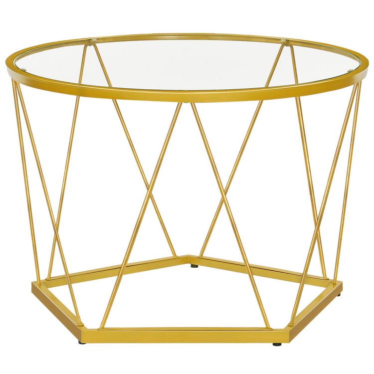 table basse, table basse en verre en or pour le salon, 27.6" table basse ronde, 1 table centrale de couche, cadre métallique, conception hexagonale, pour un petit espace, salle de réception, appartement, doré