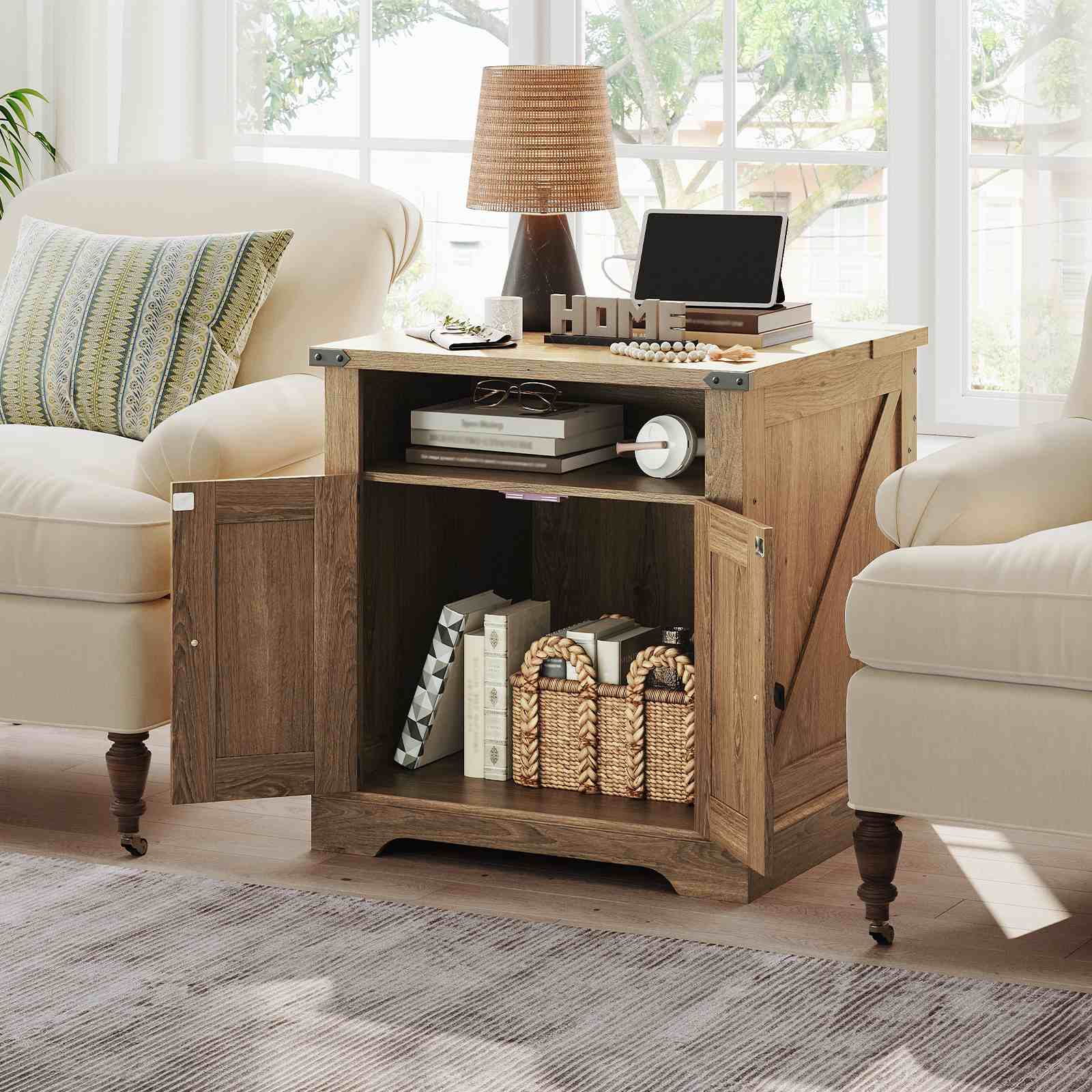 Capacité de stockage suffisante: With overall dimensions of 60cm (L) × 60cm (W) × 65cm (H), this large sofa side table features a spacious tabletop and a semi-open cubby for placing remotes, alarm clocks and other daily essentials. The rattan barn door cabinet provides hidden storage space for baskets, couvertures, livres et revues.