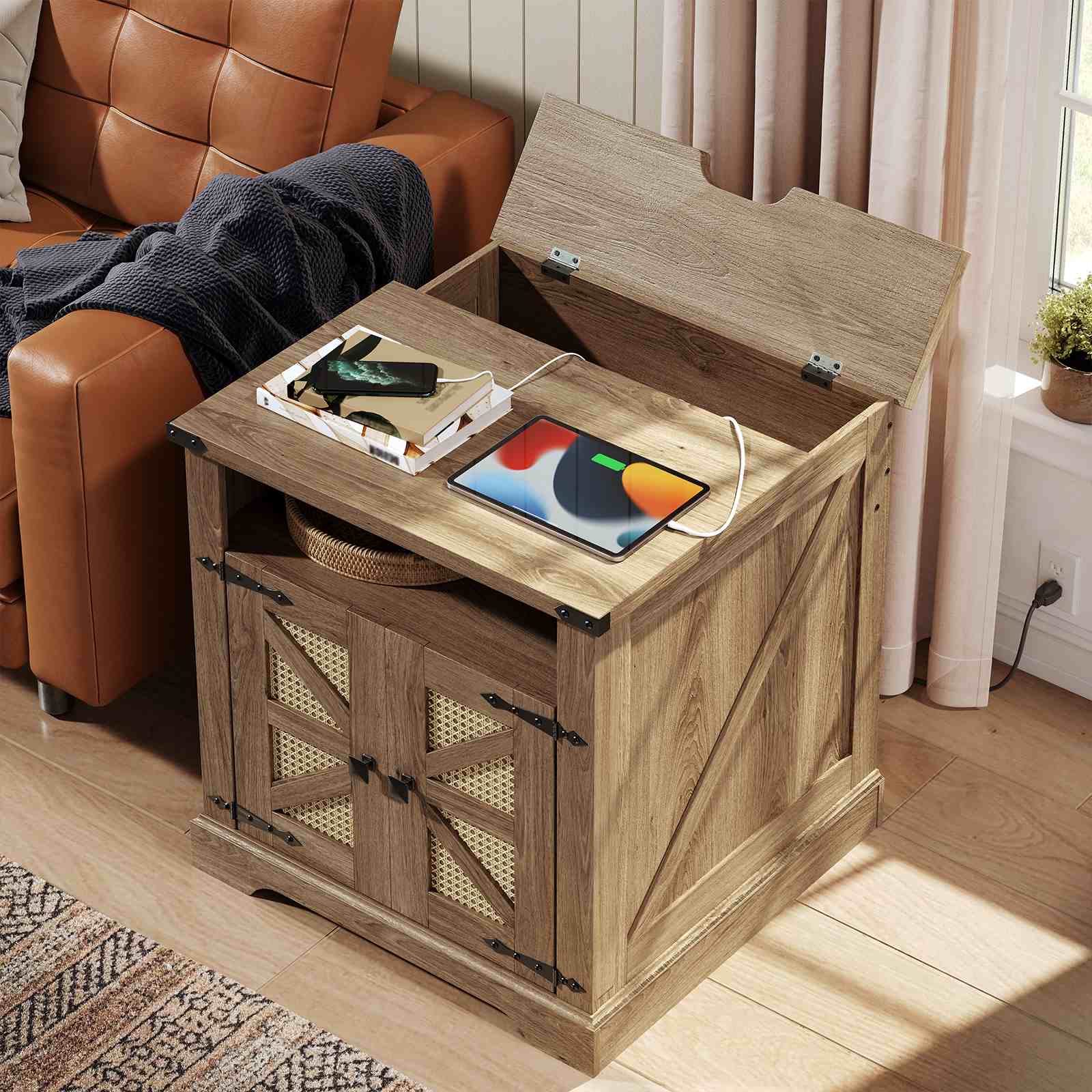 Farmhouse Flip-Top End Table with Charging Station, Tan Brown 60cm Square Side Table with Rattan Barn Door, Open Storage Nightstand for Living Room
