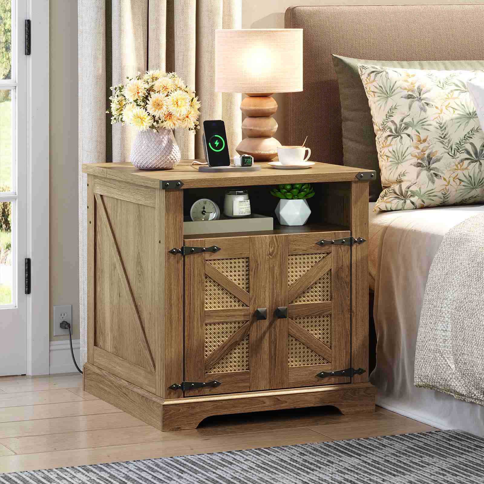 Elegant Farmhouse Aesthetics: This square farmhouse nightstand adopts a tan brown finish, paired with metal corners, faux rattan barn doors and diamond-shaped handles, presenting a warm farmhouse style. It is compatible with various home decoration styles, adding warmth and texture to the space.