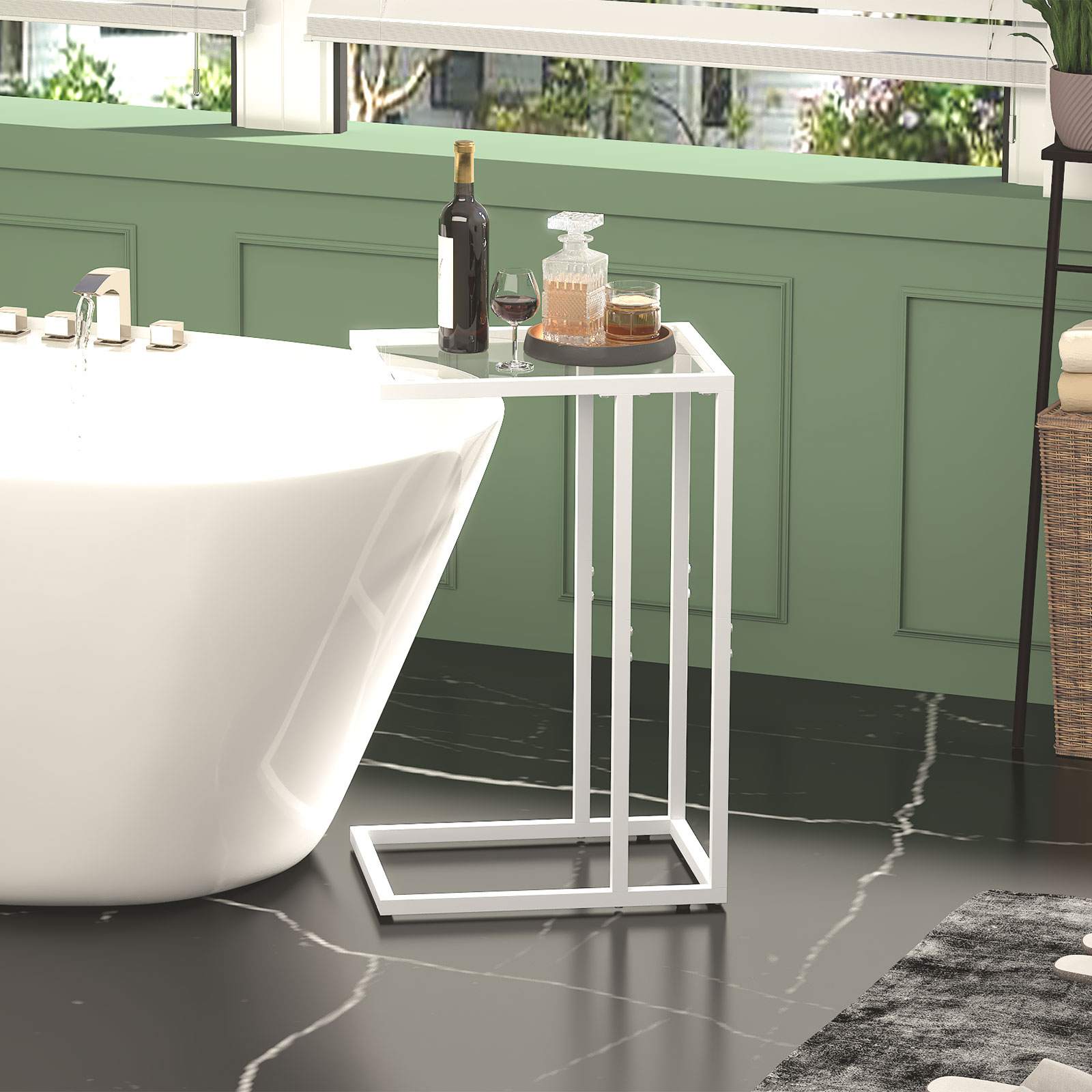 Table d'appoint en forme de C en verre trempé blanc avec structure en métal, Snack multifonctionnel de style moderne & Table de bout pour ordinateur portable pour petits espaces, Canapé, Canapé et lit