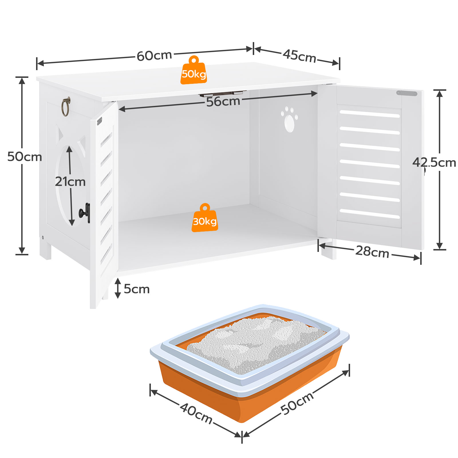 Dimensions optimales & Capacité de charge: With an overall size of 60 x 45 x 50 cm, the enclosure can accommodate most standard-sized cat litter boxes. It has a maximum load-bearing capacity of 30kg, making it suitable for cats of all sizes, including large or overweight breeds.
