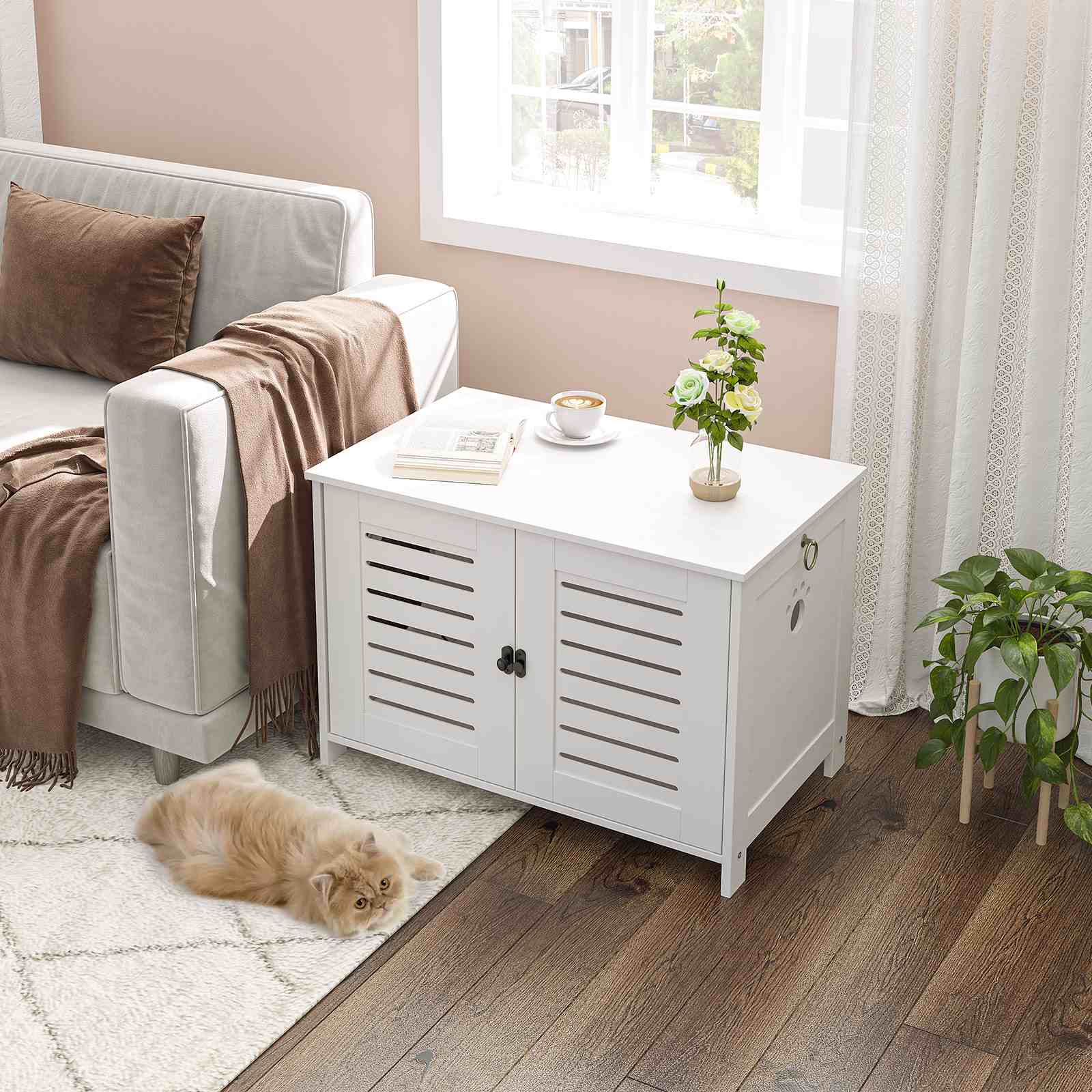 Double-Door with Louvered Design: The enclosure is equipped with a double-door structure for convenient opening and closing, facilitating easy cleaning of the litter box and hassle-free placement. The classic louvered design on the doors enhances air circulation, effectively reducing odor accumulation during use.