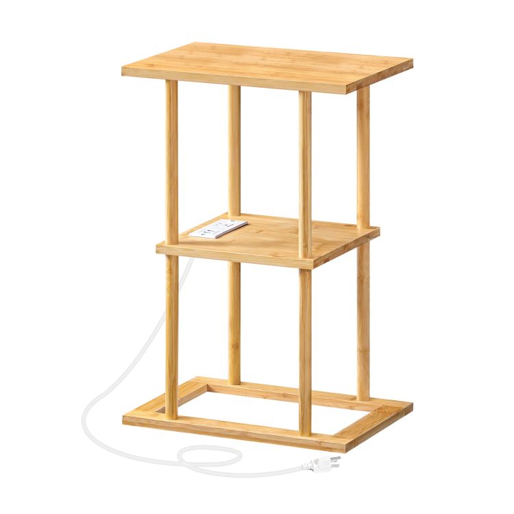 Table d'appoint en bambou avec station de charge, 2-Tableau de petite table avec étagères de rangement, Table de chevet en bambou, Assemblage facile, pour le salon, Chambre à coucher, Bureau, Naturel