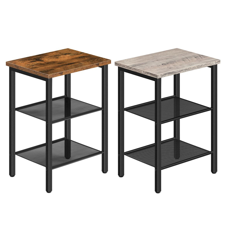 seastáin oíche tacar de 2, 3-Tábla taobh na sraitheanna le seilf inchoigeartaithe, Tábla deiridh tionsclaíoch do spás beag sa seomra suí, seomra leapa agus balcóin, fráma miotail cobhsaí, donn tuaithe
