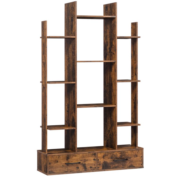 leabhragán, leabhragán le 2 tarraiceáin, rustic tree shaped wooden bookshelves with 12 seilfeanna stórála, free standing book shelf for bedroom, oifig bhaile, seomra suí, bf140sj01