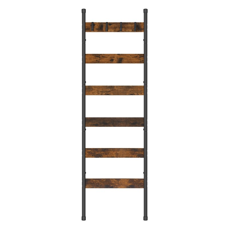 Takaró létra, 6-Szintű törülközőtartó horgokkal, Falfestő takaróállvány, Dekoratív kijelző létra polc, Sálak, Ipari, Nappali, Hálószoba, Rusztikus barna és fekete