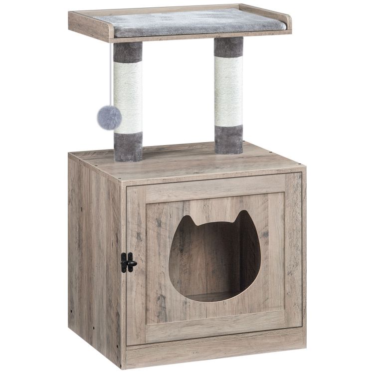 alom dobozház macskafa toronyval, alomdoboz bútorok, aranyos bejárattal rejtve, Saját mosdó szizális karcolóoszlopokkal, macskafej ajtó és nagy platform, grey bg11mw03