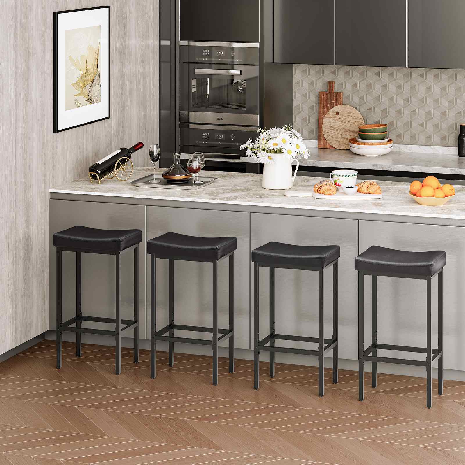 Design ergonomico e confortevole: Ogni sgabello da bar è dotato di un sedile a sella curvo rivestito in pelle PU di alta qualità e di un cuscinetto in spugna ergonomico spesso 2,4 pollici. La superficie sagomata garantisce una distribuzione uniforme del peso, riducendo efficacemente la pressione corporea e offrendo un'esperienza di seduta confortevole durante l'uso prolungato.