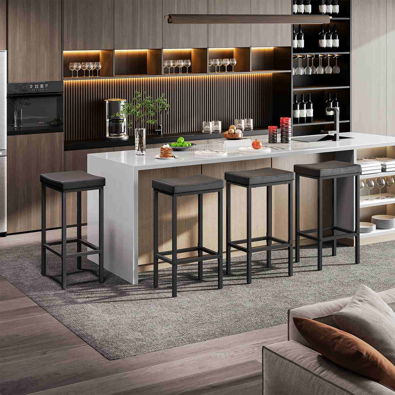 Estetica moderna ed elegante: Adottare un linguaggio di design contemporaneo, gli sgabelli sono caratterizzati da sedili curvi in pelle PU abbinati a tubi metallici quadrati. La combinazione di colori completamente nera crea un effetto senza soluzione di continuità, aspetto sobrio e lussuoso, completando vari stili di arredamento d'interni e migliorando l'eleganza spaziale.