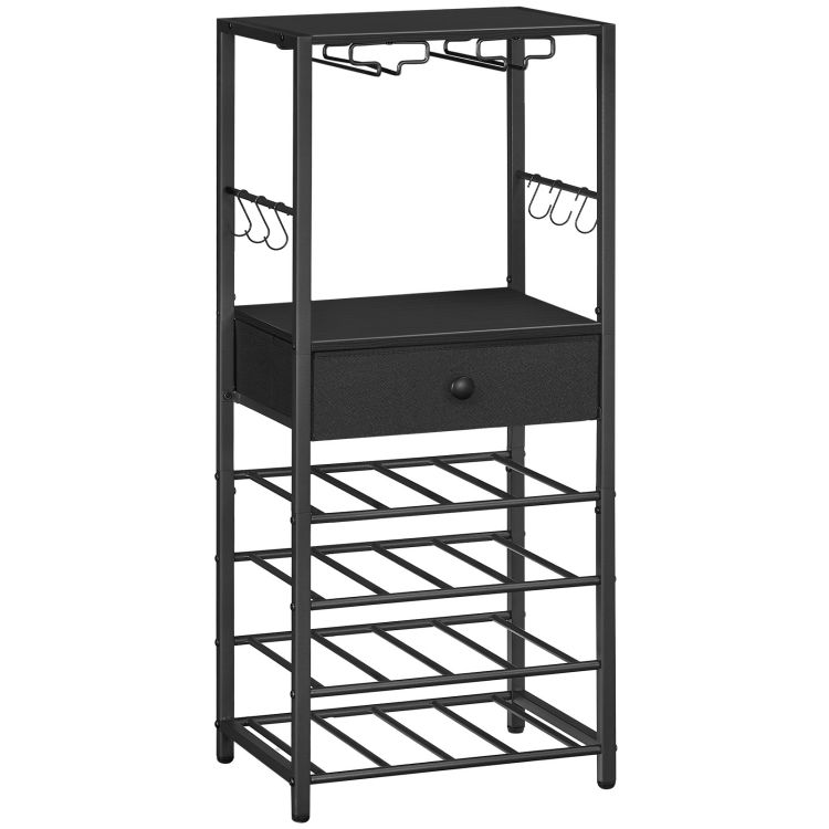 - stoccaggio diversificato: with a 4-tier wine bottle rack, 2 file di portabicchieri, 2 ripiani in legno, un cassetto in tessuto non tessuto e 6 s-shaped movable hooks on both sides, questo portabottiglie è uno spazio di archiviazione affidabile per tutti gli articoli relativi al vino