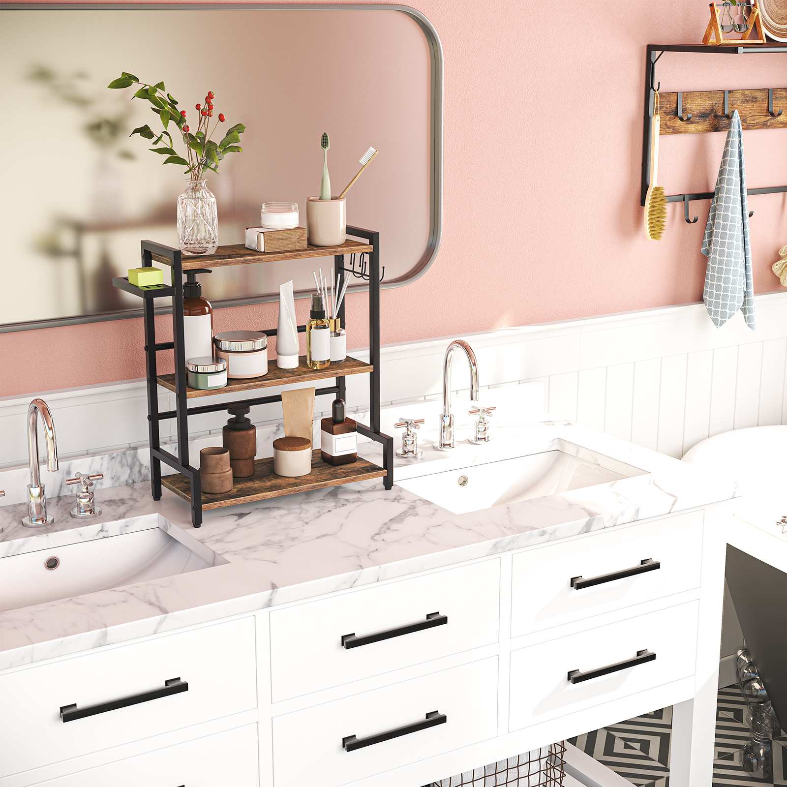 Multifunctional Storage Configuration: The shelves are adjustable to accommodate kitchen countertop items of varying heights. A small shelf on the left is designated for knives and forks, Mentre 3 hooks on the right are used for hanging rags and spatulas, effectively keeping countertops tidy.