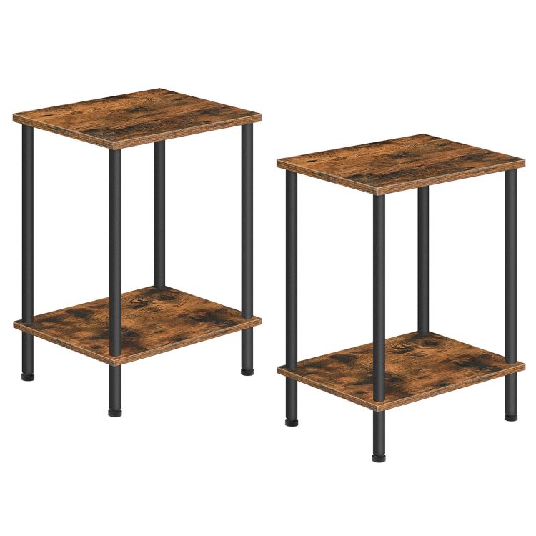 Set di tavolini finali 2, Comodino con ripiani portaoggetti a 2 strati, Tavolino per piccoli spazi, Soggiorno, Ingresso, Stile industriale, Telaio stabile, Montaggio semplice, Marrone rustico
